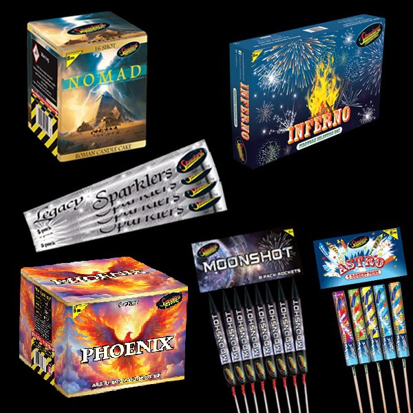 A selection of garden fireworks that are ideal for a 25m safety distance. This package includes the following: 1 x Selection Box, 2 x Pack of Rockets, 2 x Medium Roman Candle Cakes and Outdoor Sparklers.